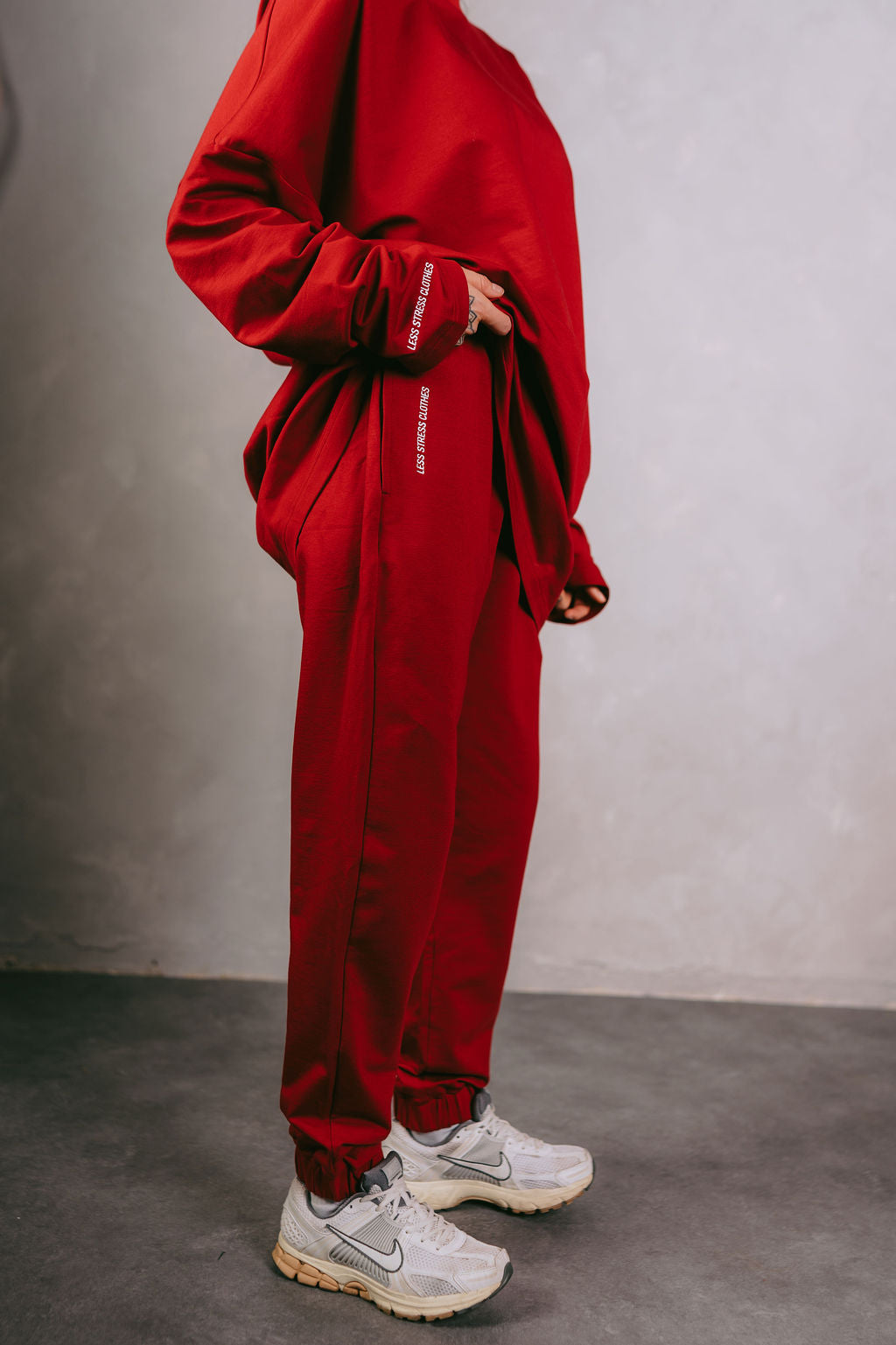The official LESS STRESS CLOTHES brand logo is embroidered on the pocket of the pants.